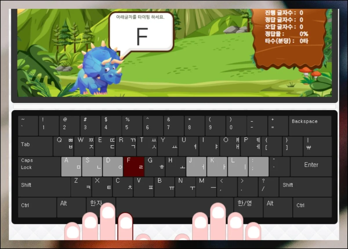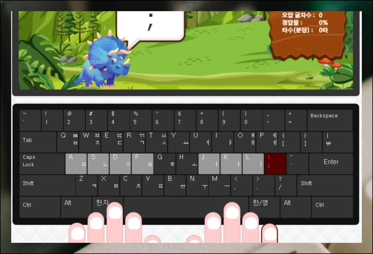 미음 글쇠는 왼손 새끼손가락으로 눌러야 하는 식입니다. 올바른 손가락 배치를 익히는 것이 속도 개선의 핵심이 되니까 공룡 타자연습을 통해 기본기를 쌓으세요.