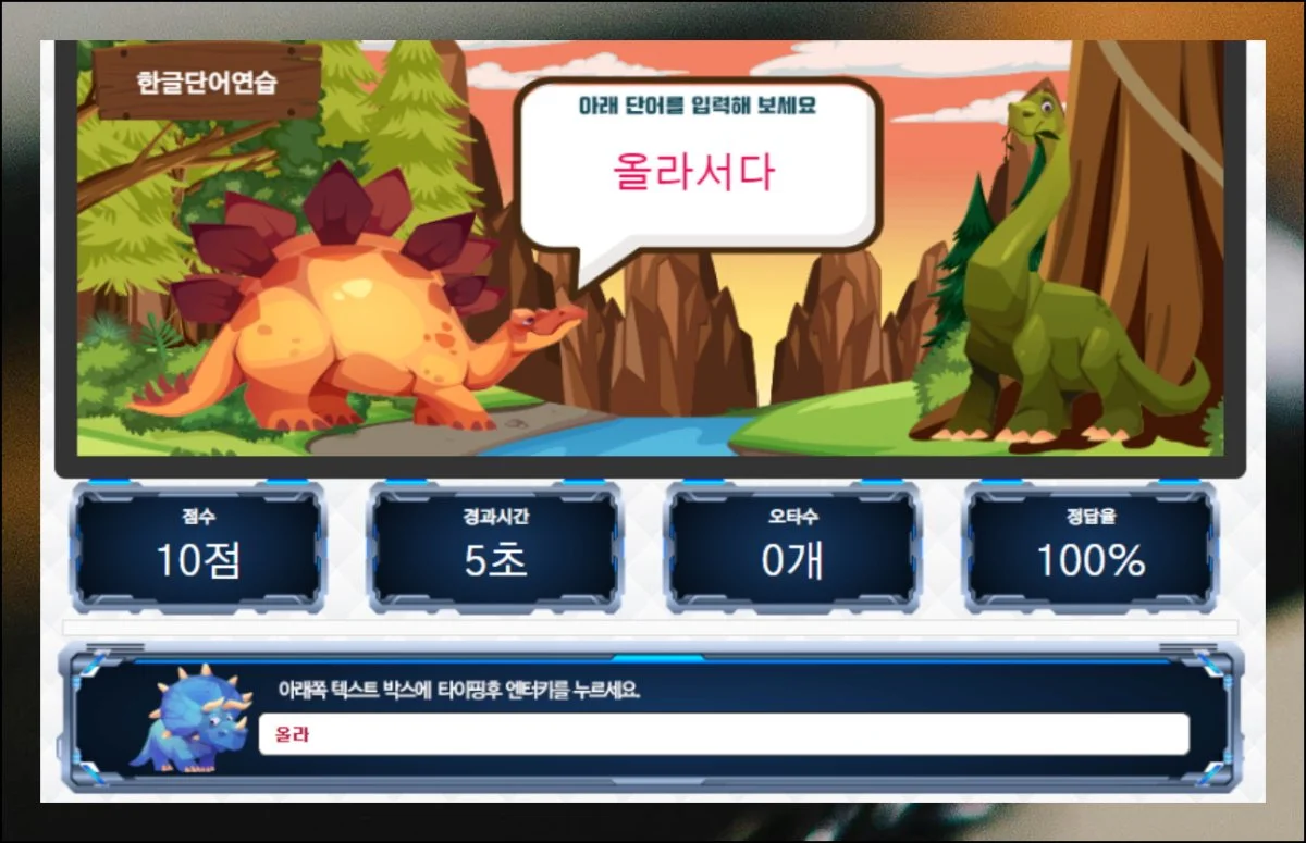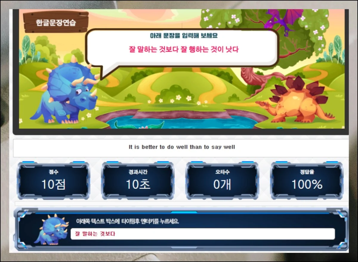 우측에는 관련 이미지가 표시되고, 좌측에서는 속도와 정확도를 실시간으로 체크할 수 있어요. 공룡 플랫폼만의 시각적 요소가 더해져서 흥미롭게 이어갈 수 있습니다.