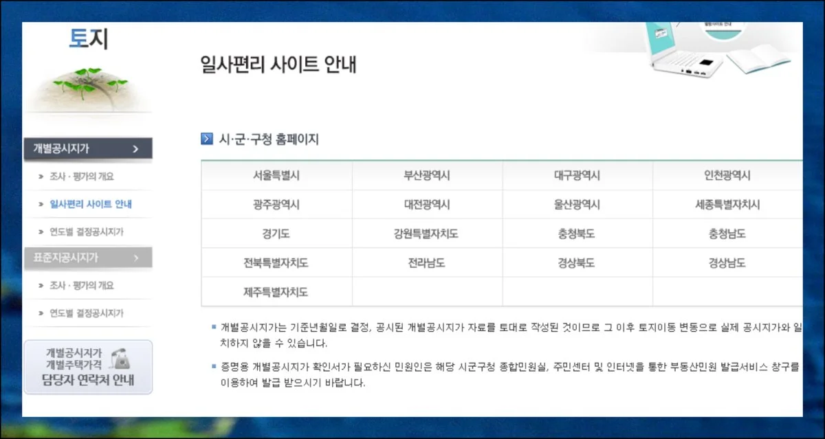 지방자치단체가 운영하는 사이트를 통해서도 개별 공시지가를 조회하는 것도 가능합니다. 다만 기준 시점에 따라 현재 시세와 차이가 발생할 수 있으니 참고 자료로만 활용하는 것이 좋아요.