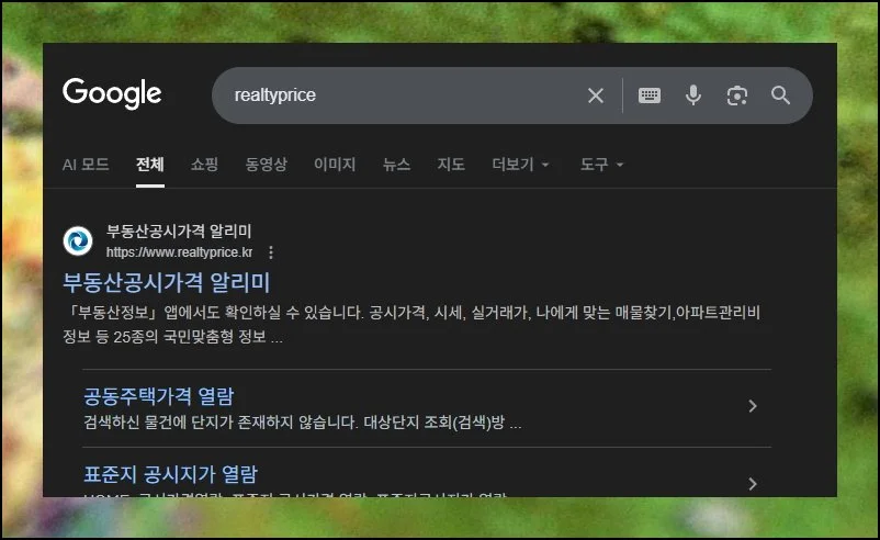국토교통부에서 운영하는 공시지가 조회 플랫폼은 별도의 회원 등록 없이 누구나 접근할 수 있어요. 검색창에 “REALTYPRICE”를 입력하면 부동산 공시가격 알리미 사이트로 바로 이동합니다.