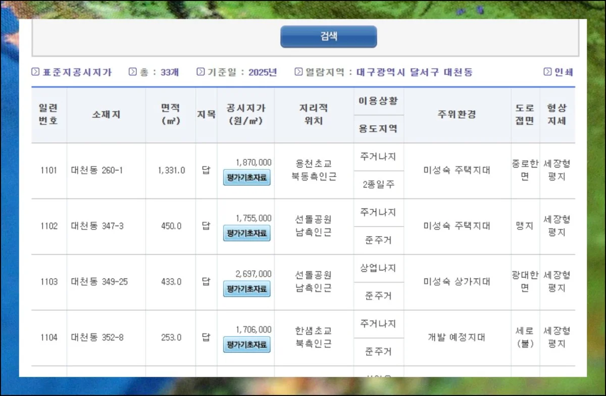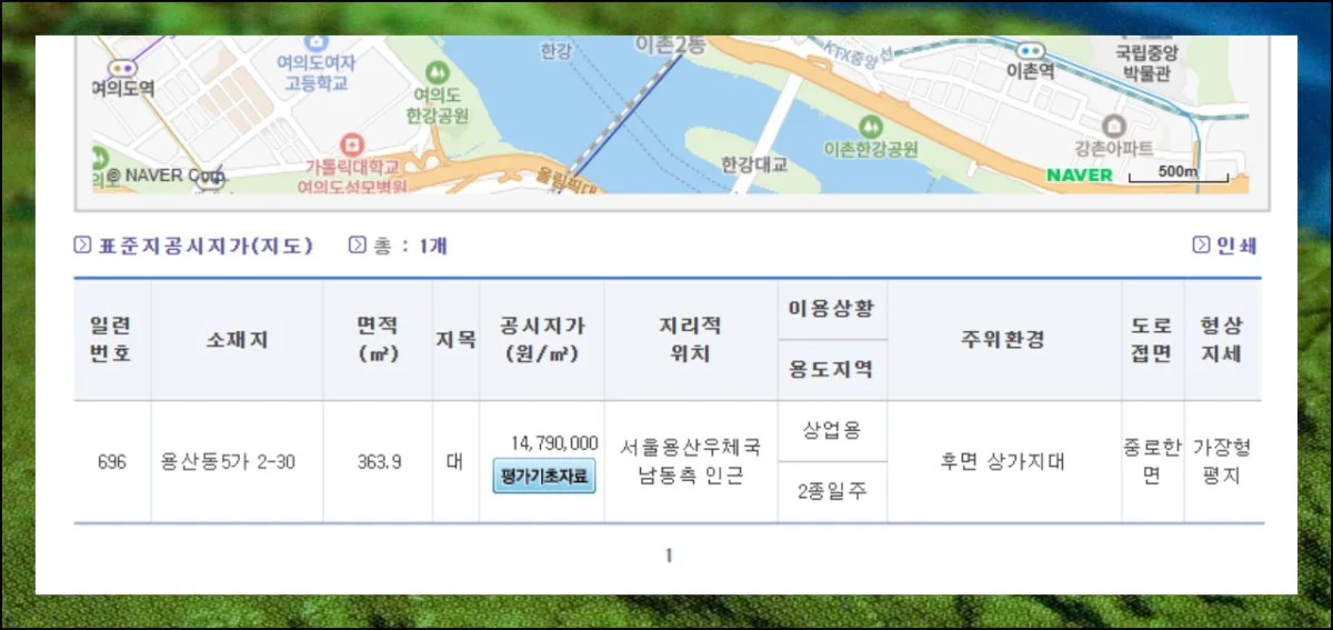 고유번호, 소재지, 면적 같은 세부 항목들을 빠르게 확인할 수 있습니다. 특히 면적당 단가가 명시되어 있어 매매나 세금 계산 시 유용한 기준이 돼요.
