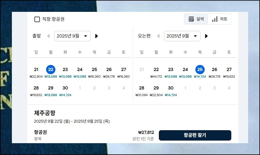 여기 안에서도 상대적으로 저렴한 구간들이 존재합니다. 실제 예시로 9월 22일 출발해서 25일에 돌아오는 일정을 검색해보았는데요. 왕복 2만원대 후반 수준의 합리적인 가격대를 발견할 수 있어요.