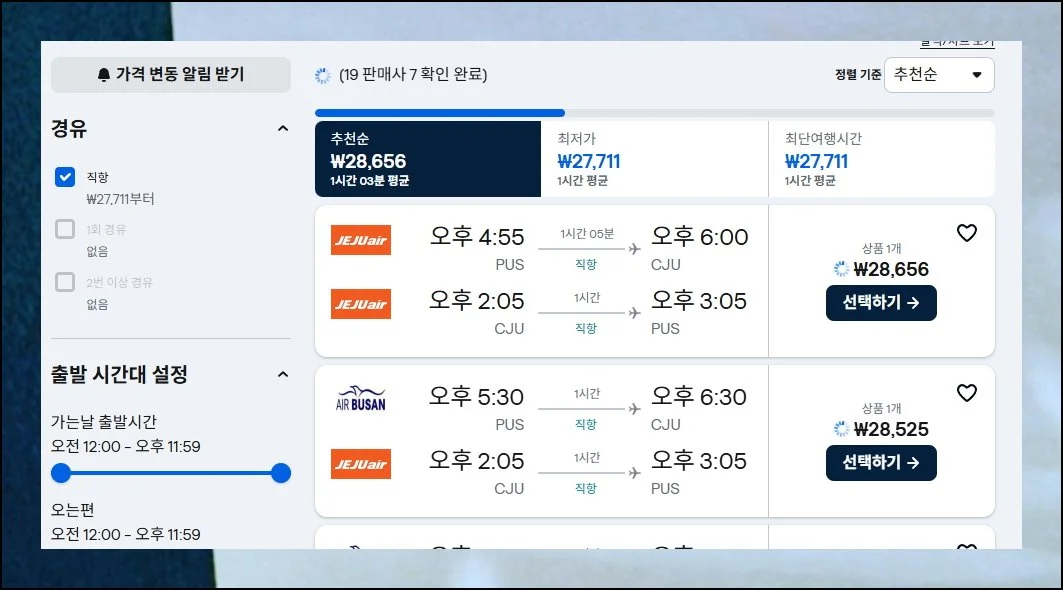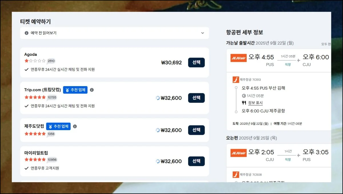 김해에서 제주로 가는 모든 항공편을 동시에 비교할 수 있고, 여러 항공사의 스케줄과 가격 정보를 한눈에 파악할 수 있거든요. 시간 절약은 물론이고, 더 나은 선택지를 찾을 가능성이 높아집니다.