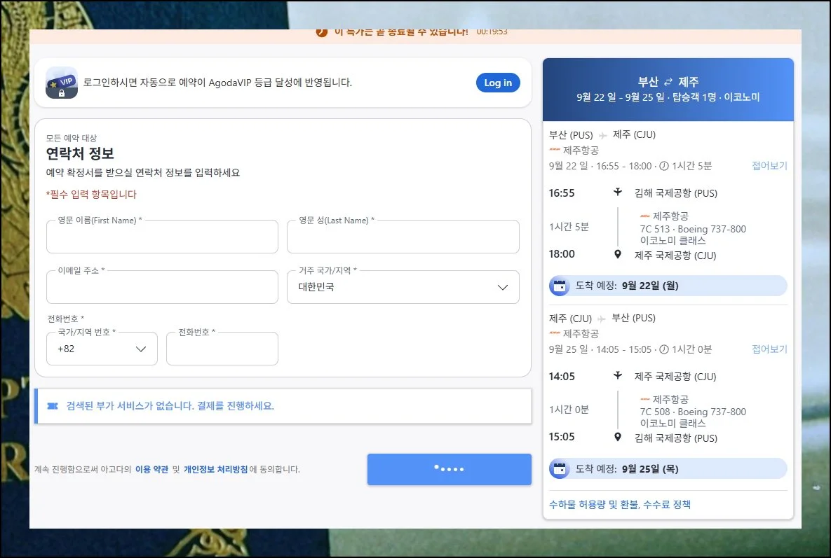 예약 확정 버튼을 클릭하기 전에 모든 세부사항을 한 번 더 점검해보세요. 부산 김해 국제공항 출발 시간과 제주 공항 도착 시간, 그리고 돌아오는 비행편 일정까지 정확한지 재확인하는 것이 중요해요.