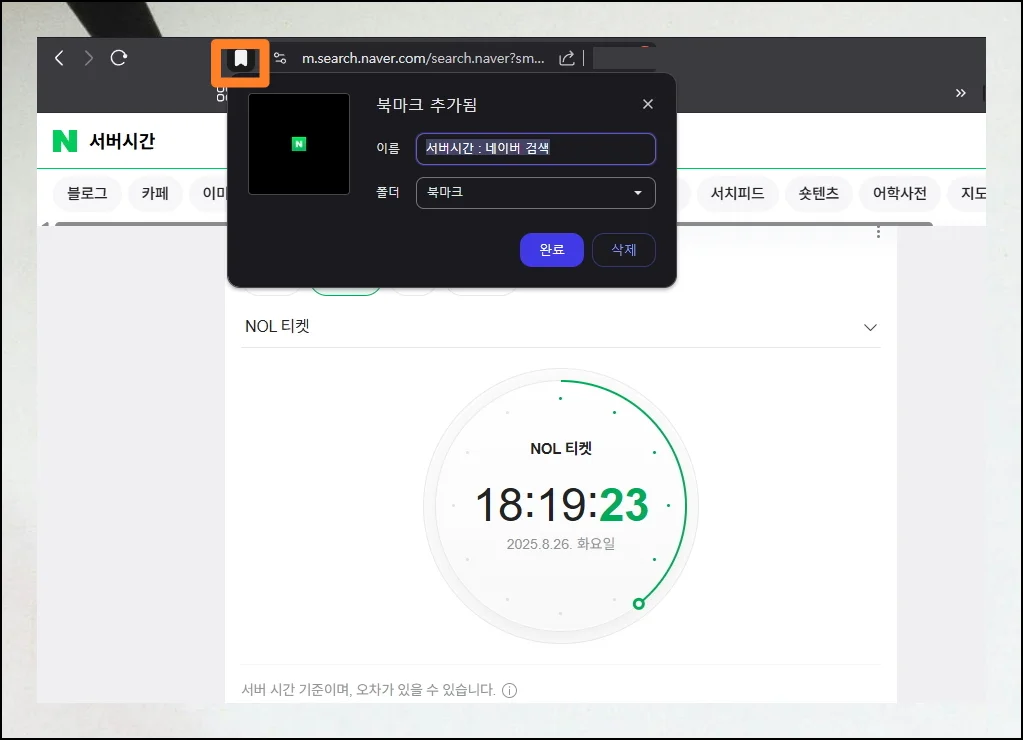 포털 검색창에 “서버시간”을 입력하여 해당 페이지로 이동해보세요. 그 다음 브라우저 주소창 근처에 있는 즐겨찾기 아이콘을 클릭합니다.