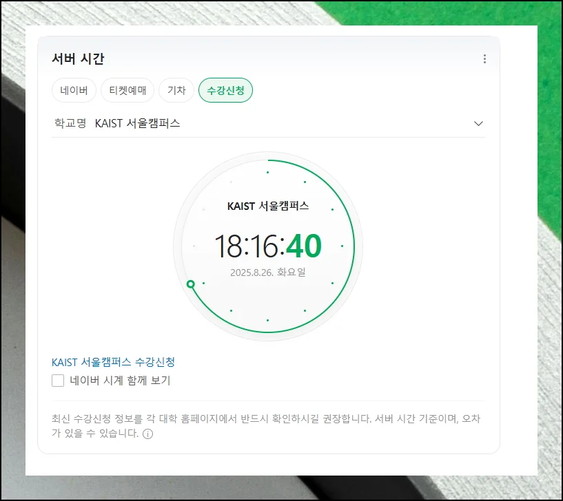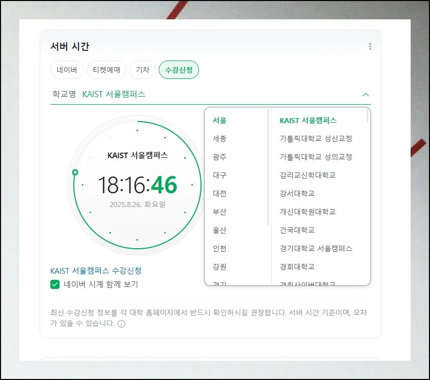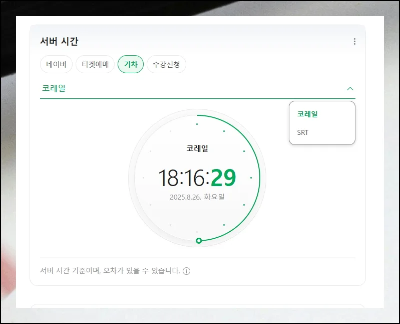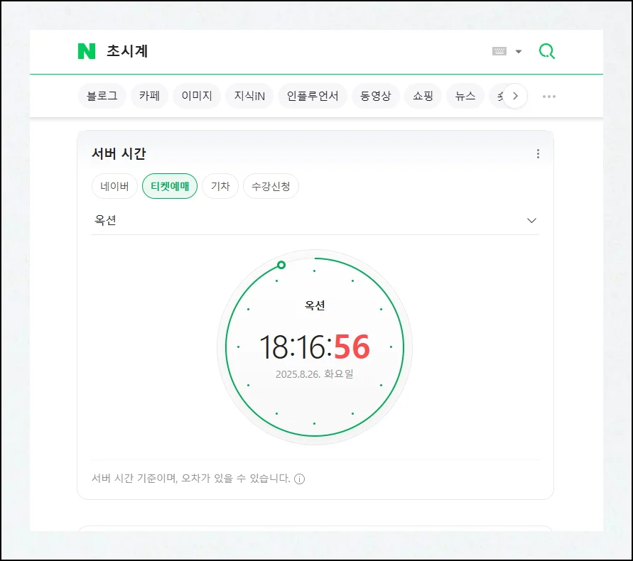 네이버 시계는 자체 서버뿐만 아니라 국내 대표 온라인 쇼핑 플랫폼인 지마켓, 11번가, 쿠팡실시간 서버시간도 동시에 제공합니다.
