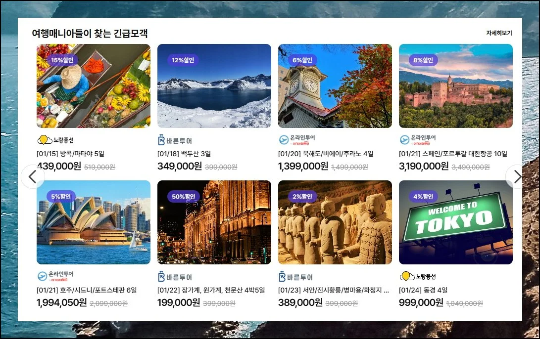 이럴 때 여러 업체를 한눈에 비교할 수 있는 플랫폼을 활용하면 훨씬 효율적이에요. 특히 출발일이 임박한 상품들은 파격적인 할인가로 나오는 경우가 많아서 잘만 찾으면 큰 이득을 볼 수 있습니다.