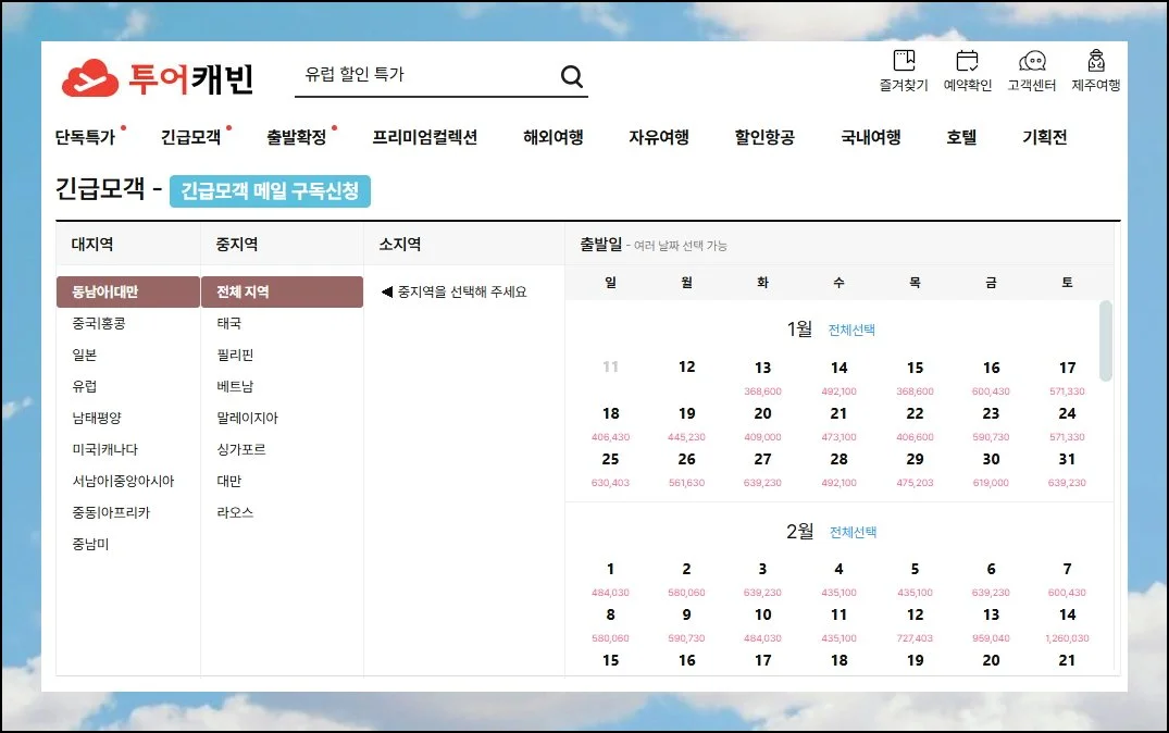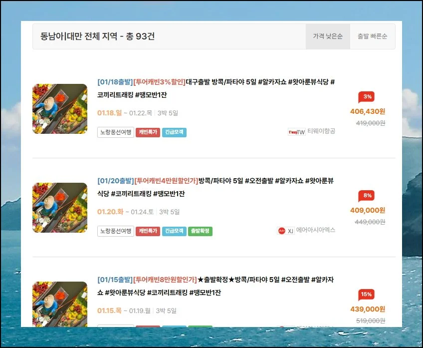 과거에는 노랑풍선 공식 홈페이지를 직접 방문해서 땡처리 상품을 찾았어요. 투어캐빈 같은 비교사이트를 이용하면 여러 패키지를 꼼꼼하게 비교할 수 있어 훨씬 편리합니다.