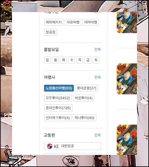 그다음 오른쪽에서 노랑풍선을 지정하면 됩니다. 땡처리는 보통 패키지 투어를 의미하는 경우가 많아요.