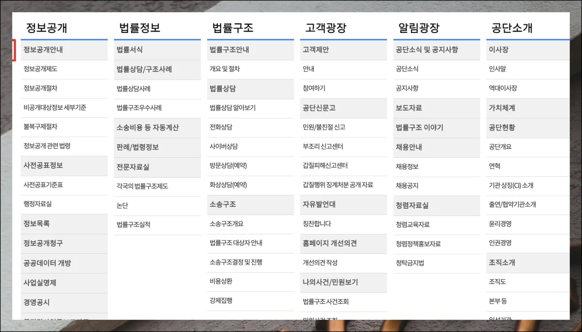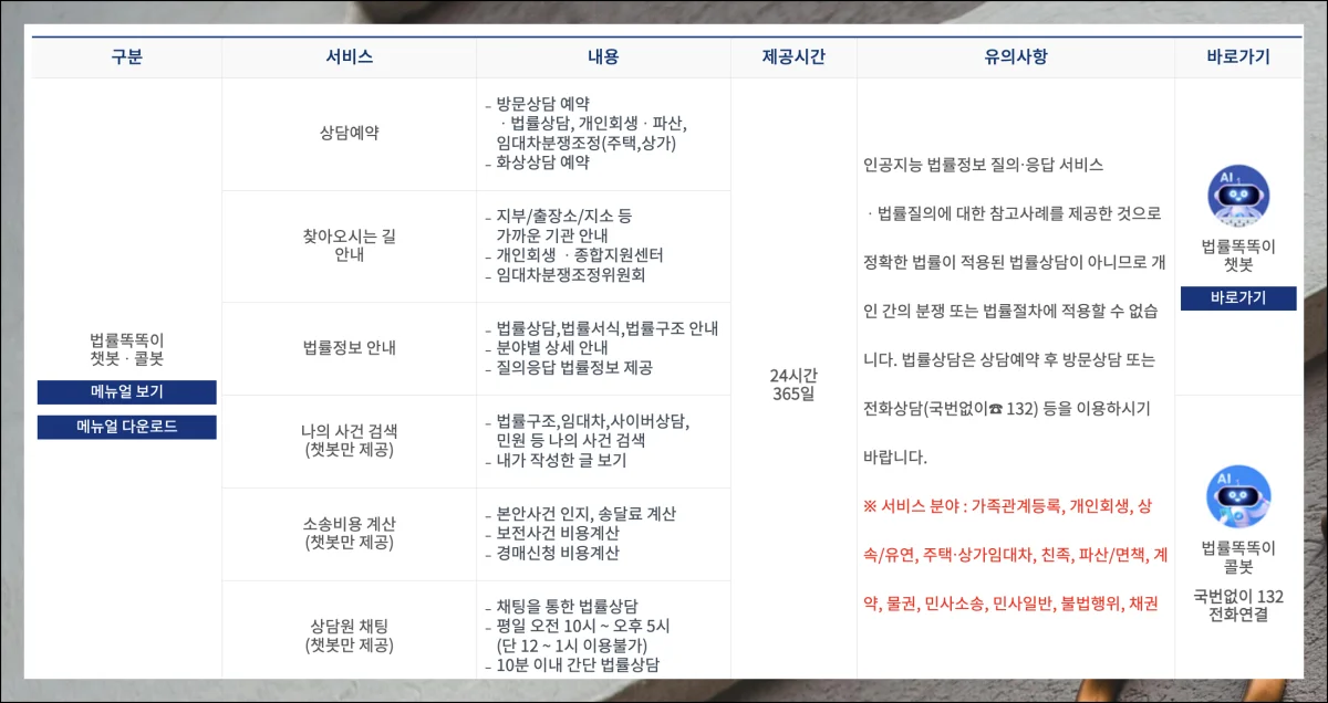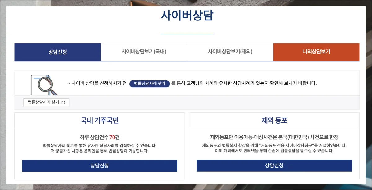 공식 홈페이지를 통해 활용할 수 있는 법률 서비스는 생각보다 많아요. 거의 모든 서비스가 무료로 제공됩니다.
