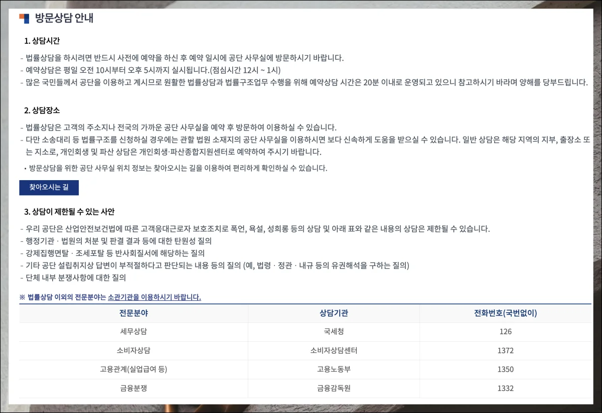 기관 방문 전에 대한법률구조공단 홈페이지를 먼저 둘러보세요. 이곳에서 방문 예약을 처리할 수 있기 때문입니다.