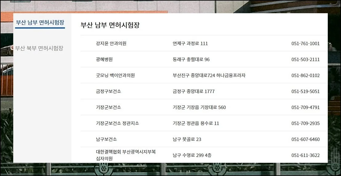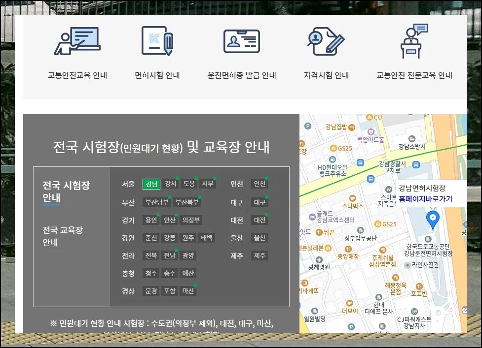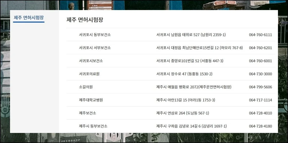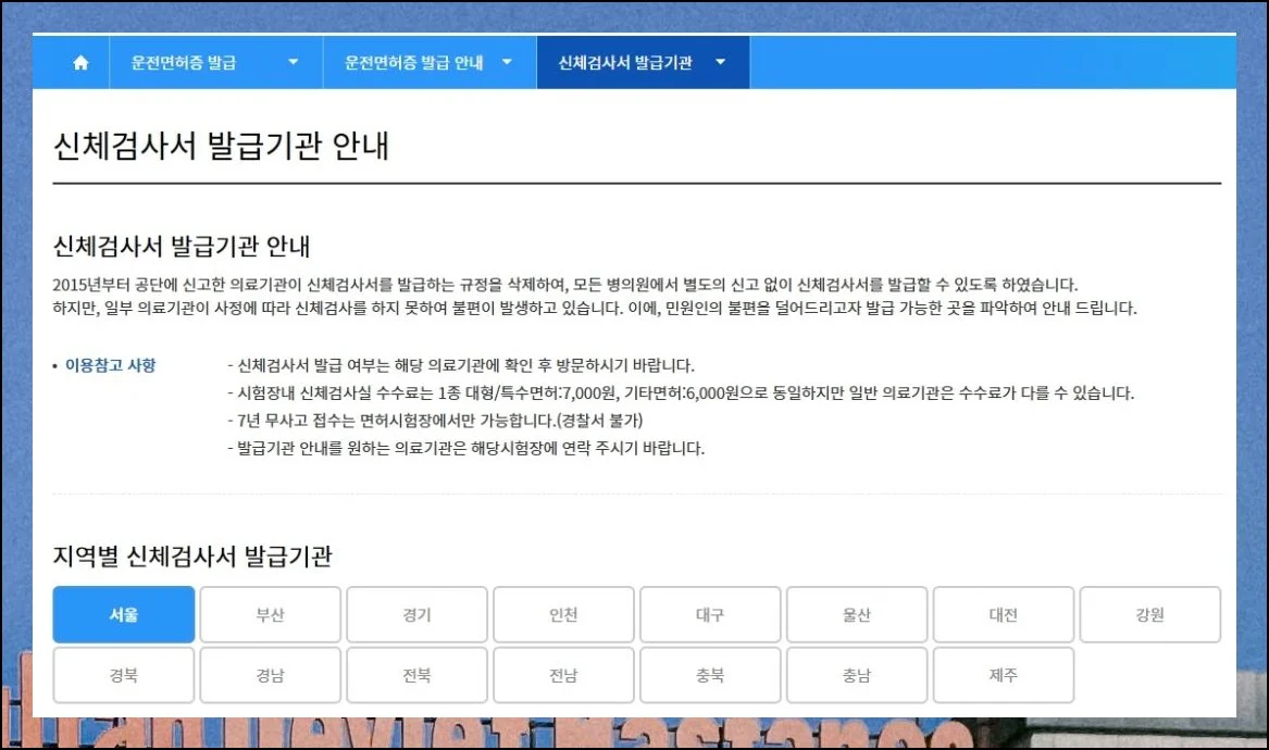 도로교통공단 통합민원 포털의 권역별 검진기관 안내 코너에서는 서울, 부산, 경기, 인천을 비롯해 대구, 울산, 강원, 대전, 경남, 전남, 전북, 충북, 충남, 제주에 이르기까지 광범위한 지역을 포괄하고 있어요.