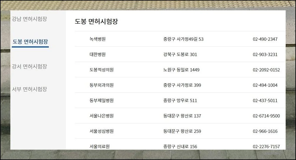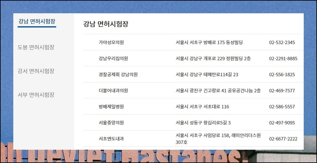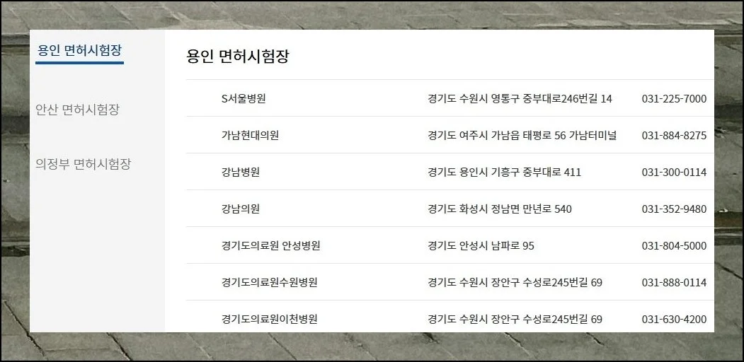 2015년 관련 규정이 개편되면서 원칙적으로 어떤 의료기관이든 면허용 검진을 실시할 수 있게 되었어요. 그렇지만 현실적으로 해당 업무를 취급하지 않는 곳도 존재하므로 도로교통공단에서 공인한 지정병원 리스트를 미리 파악해두는 편이 안전합니다.