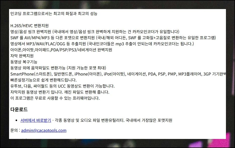 스마트폰이나 태블릿에서 콘텐츠를 재생할 때 더 수월하게 보고 싶다면 이걸 추천해요. 무료로 제공되는 카카오 인코더라는 변환 프로그램을 활용하면 간단하게 처리할 수 있어요. 검색창에 입력해서 제작사 홈페이지로 들어가 주세요.