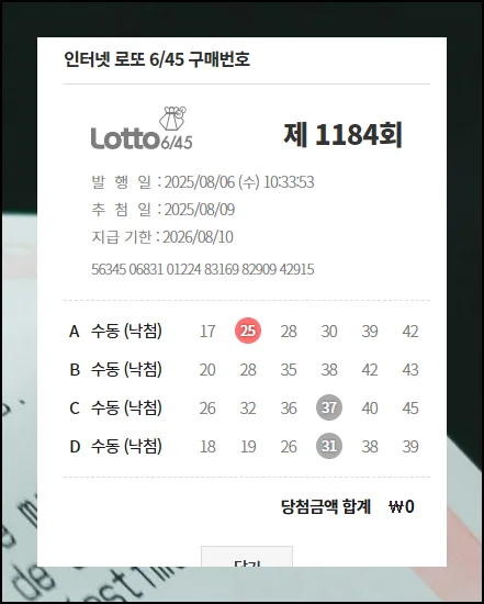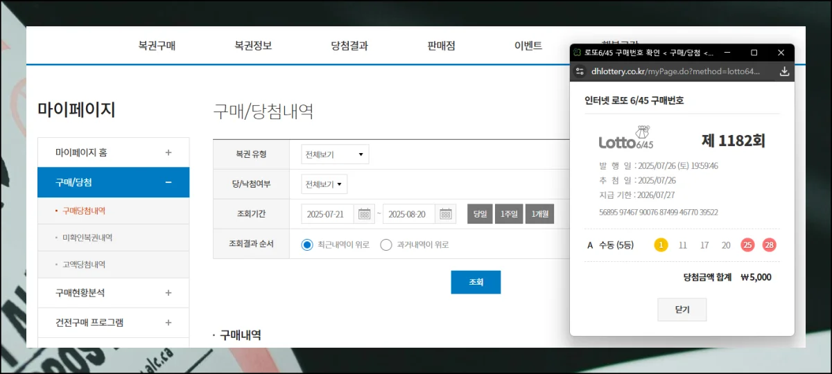 구입이 완료되면 마이페이지의 구매내역에서 선정한 번호들을 확인할 수 있으며, 추첨일 익일부터 당첨 결과 조회가 가능해요.
