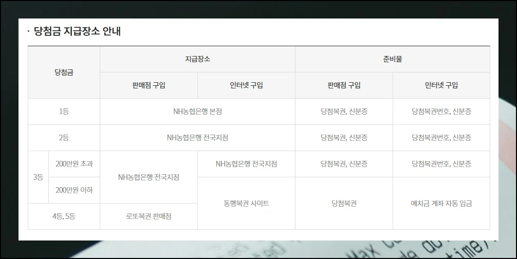 1등부터 3등까지의 고액 당첨자는 동행복권 홈페이지의 당첨자 확인 페이지에서 실명 인증 절차를 거쳐야 합니다. 실명 확인 완료 후에는 당첨 복권과 신분증을 준비하여 nh농협은행 지점을 방문하면 당첨금을 받을 수 있으나, 1등 당첨금의 경우 반드시 nh농협은행 본점에서만 지급받을 수 있어요.