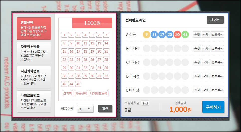 전체 번호를 컴퓨터가 무작위로 선택해주는 방식으로 구매할 게임 수량만 정하고 확인 버튼을 누르면 즉시 번호가 배정이 돼요. 또한 자주 구입하는 고정 번호가 있다면 나의 로또 번호 기능을 통해 미리 저장해두면 매회 반복 구매가 쉽게 할 수 있습니다.
