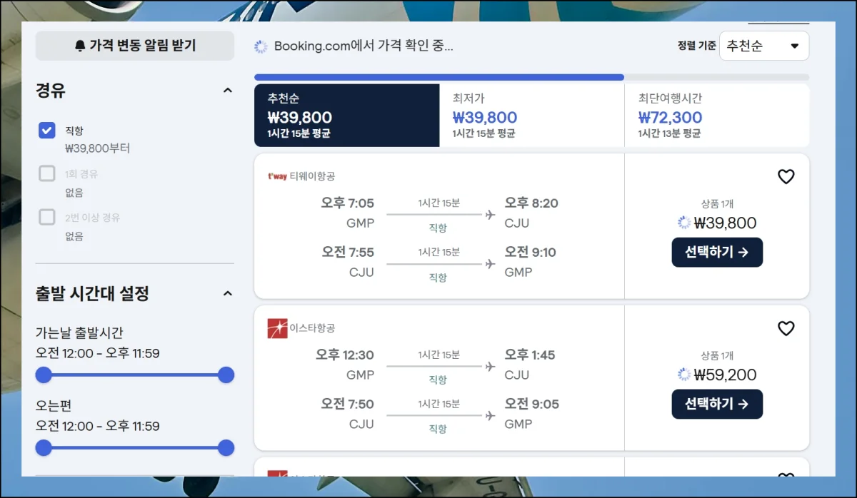 특정 날짜를 선택하면 여러 출발 시간 옵션들이 나타나요. 항공사와 시간대에 따른 요금 격차를 세심하게 살펴보세요.
