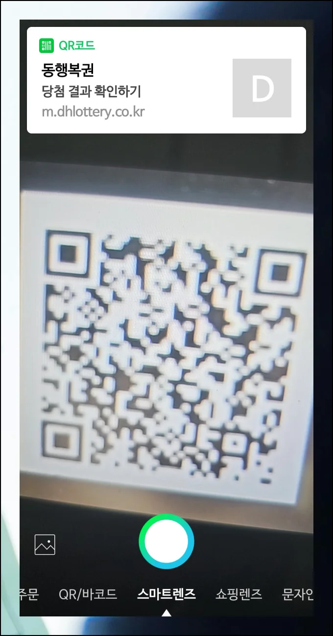 스마트렌즈 화면을 로또 용지 오른쪽 상단 모서리에 위치한 큐알코드에 맞춰보세요. 화면 위쪽에 버튼이 뜨면 그것을 눌러주시면 됩니다.