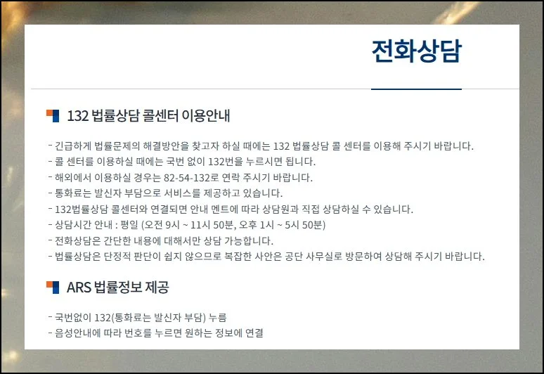 법적 고민이 있다면 전화번호 132를 기억해두세요. 이 번호로 연결하면 무료로 법률상담을 받을 수 있어요. 서비스는 무료지만 통화료는 별도로 발생합니다.