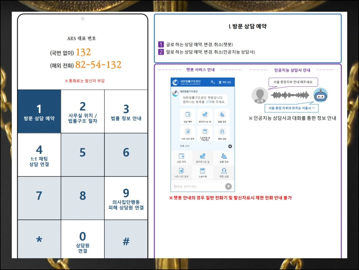 법률상담 자동응답은 생각보다 간단해요. 안내 이미지를 보면 상황별로 어떤 번호를 눌러야 하는지 바로 이해할 수 있습니다.