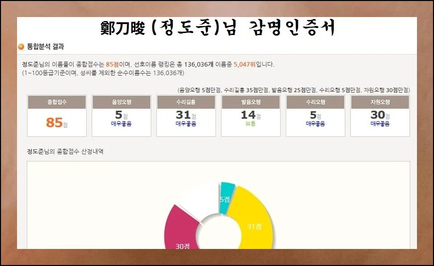 사이트 내 한자 제안 화면에서 풀이 보기 버튼을 탭하면 무료 감명인증서가 생성돼요. 총점과 선호 순위, 성명학 세부 평가까지 한 장에 정돈된 형태로 볼 수 있습니다.