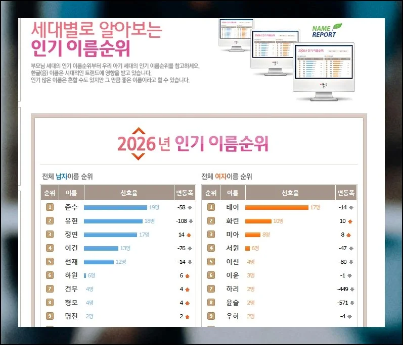 여자아이는 태이, 화린, 미아, 서원, 이진, 이윤 순으로 많이 선택되고 있어요. 이런 통계는 작명 방향을 잡아주는 좋은 길잡이가 됩니다.