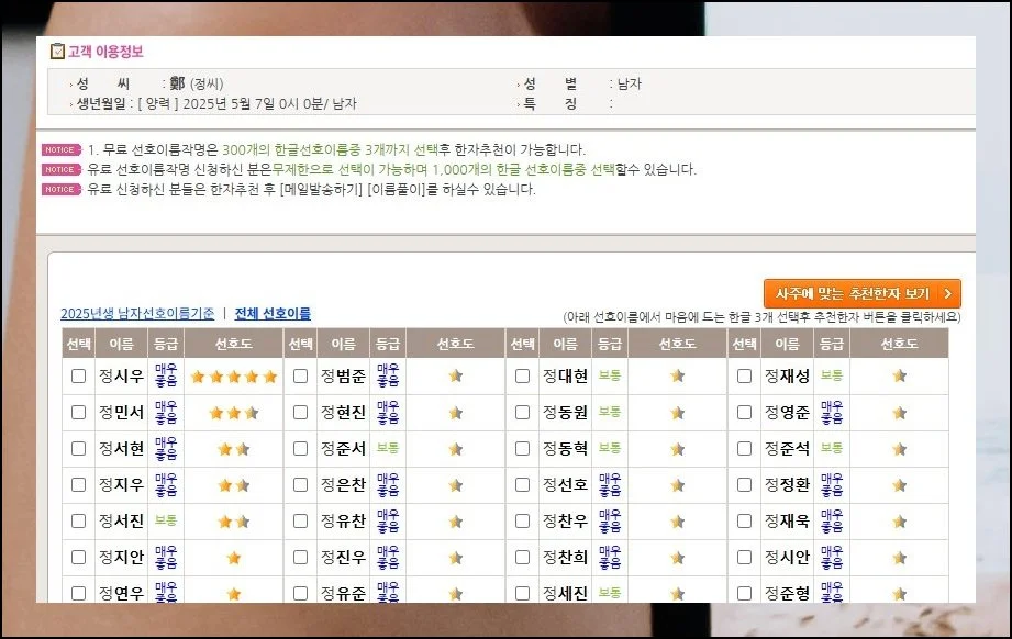 다행히 요즘에는 무료 작명 사이트를 활용하면 출생 정보를 입력하는 것만으로 체계적인 결과를 받아볼 수 있습니다. 사주에 기반한 한자 추천은 물론이고 인기 트렌드 순위와 성명학 점수 분석까지 한 곳에서 확인이 가능해요.