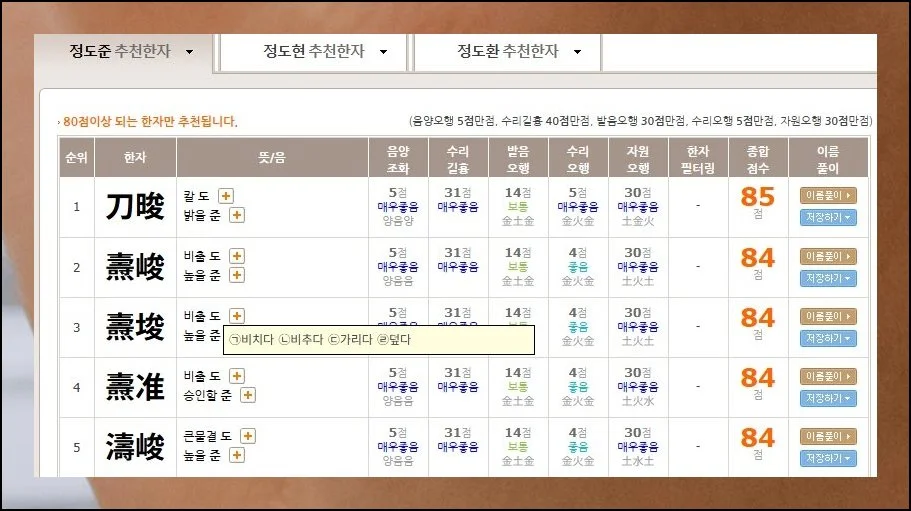 호감 가는 한글 후보 3가지를 지정한 뒤 사주 기반 한자 추천 버튼을 누르면 다섯 종류의 조합이 나옵니다.