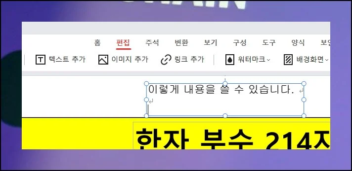 메뉴의 편집 버튼을 클릭하면 기존 텍스트를 수정할 수 있어요. 폰트 변경, 글자 크기 조절, 굵기 설정 등 원하는 스타일로 텍스트 입력이 가능합니다.