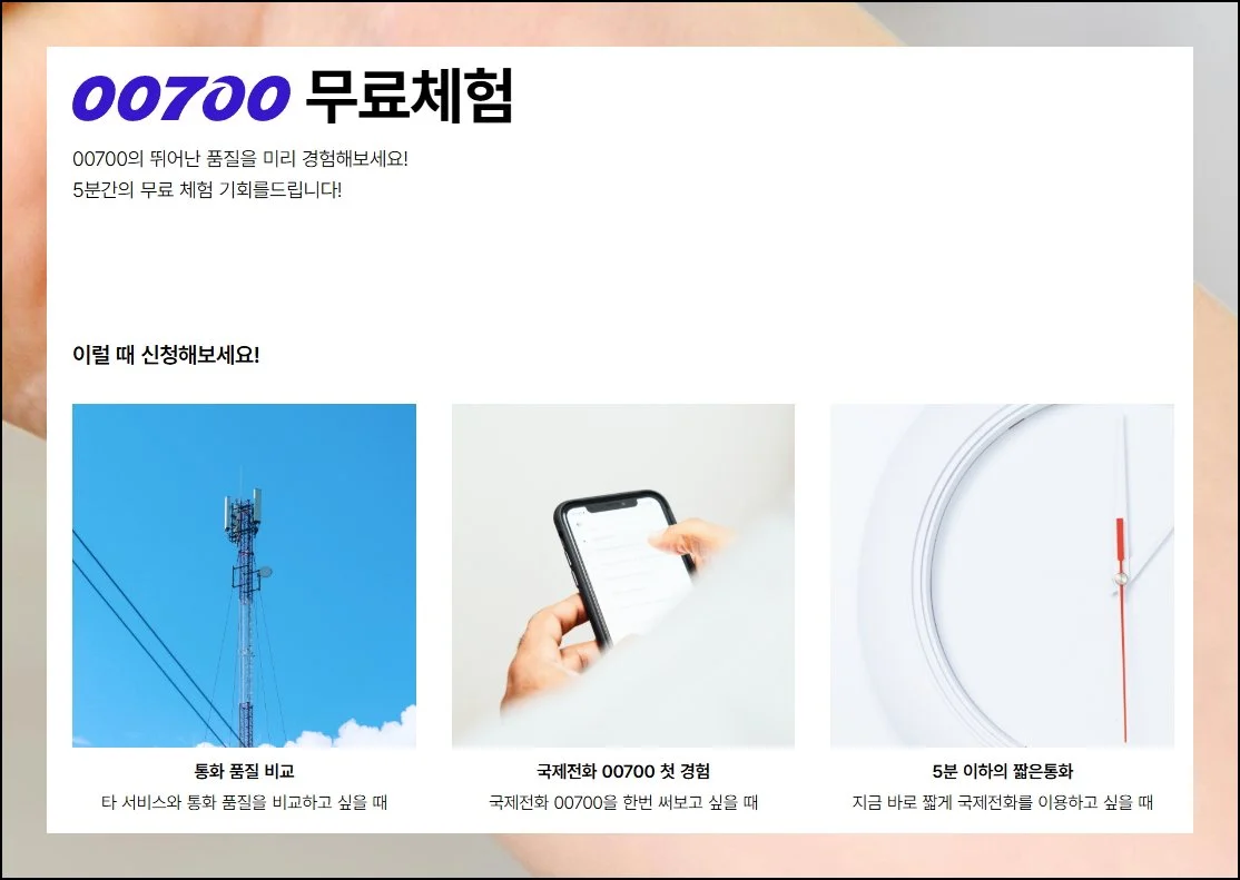 SK텔링크 홈페이지에 들어가시면 화면 하단 부분을 확인하세요. 국제전화 무료체험을 신청할 수 있는 메뉴가 있습니다.