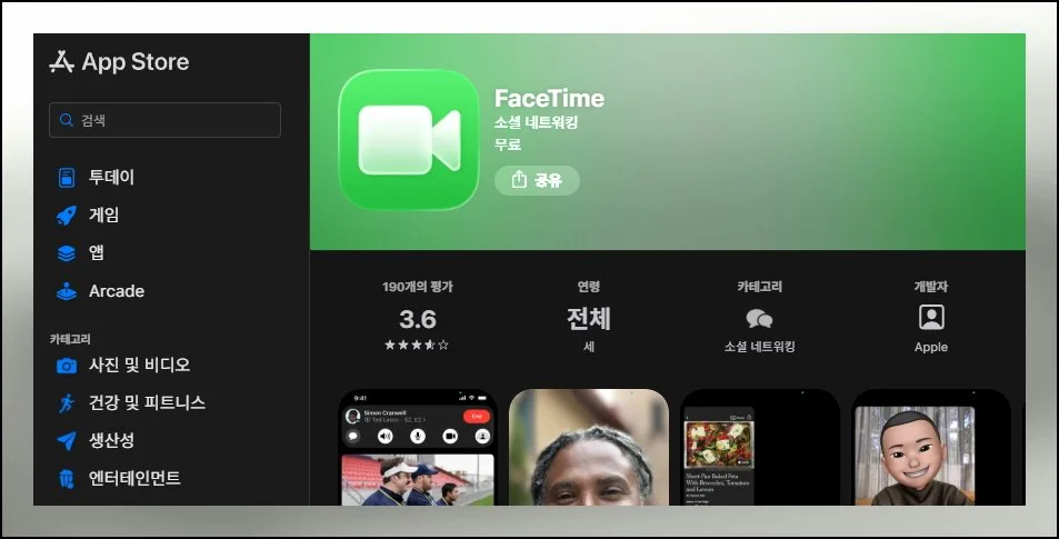아이폰에서 FACETIME 앱을 찾을 수 없는 경우가 있을 수 있어요. 이럴 때는 애플의 앱스토어에 접속해서 다운로드하세요.