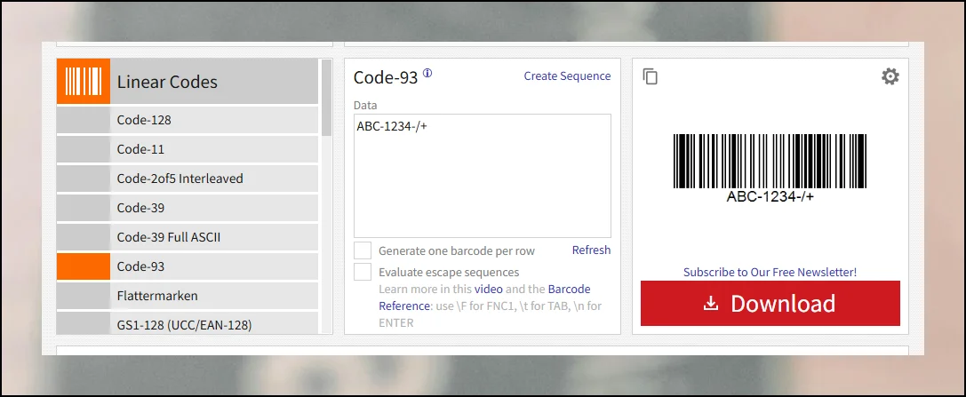 생성기 프로그램에서 좌측 패널에서 생성하고 싶은 바코드 종류를 선택하는 것부터 시작하세요. 선택이 끝나면 data 영역에 원하는 텍스트나 숫자를 입력하면 됩니다.