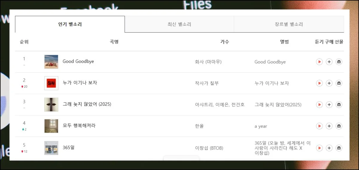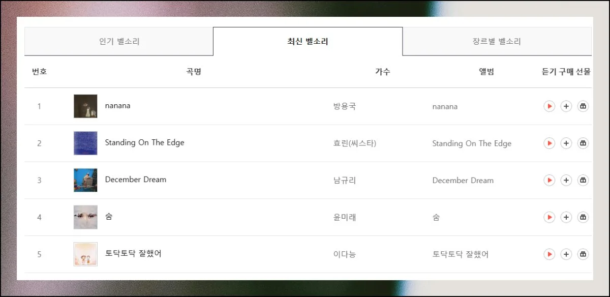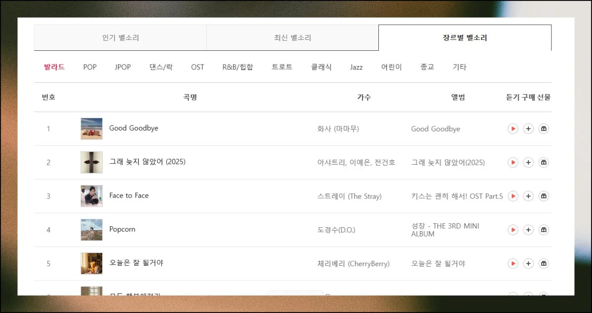 최신 히트곡 순위나 전체 인기 차트 외에도 세부적으로 나눠진 장르별 차트가 준비되어 있어요. 발라드, 팝, 힙합 같은 대중적인 음악은 기본이고요.