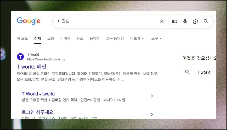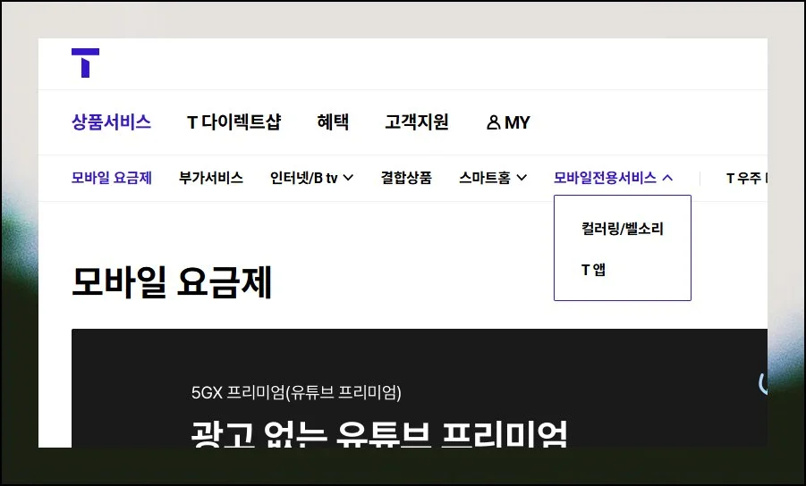 티월드 메인 페이지에 접속한 다음 화면 상단을 살펴보세요. 거기서 상품서비스라는 메뉴를 찾아 클릭하면 됩니다.