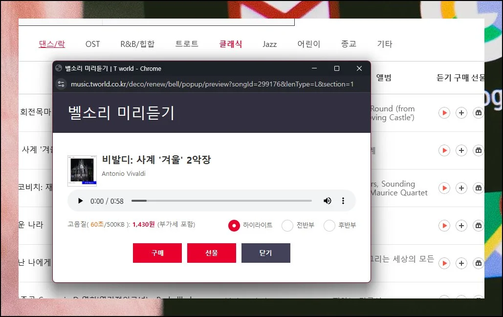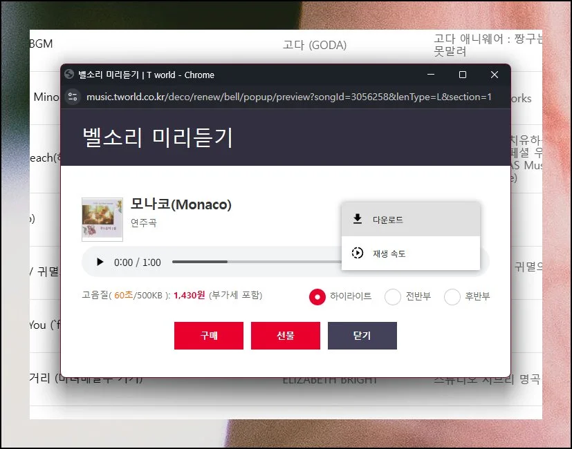 티월드가 지닌 최고의 강점은 구매 전에 실제 소리를 미리 들어볼 수 있다는 점이에요. 하이라이트 구간, 시작 부분, 끝 부분 중에서 듣고 싶은 곳을 골라 재생할 수 있습니다.
