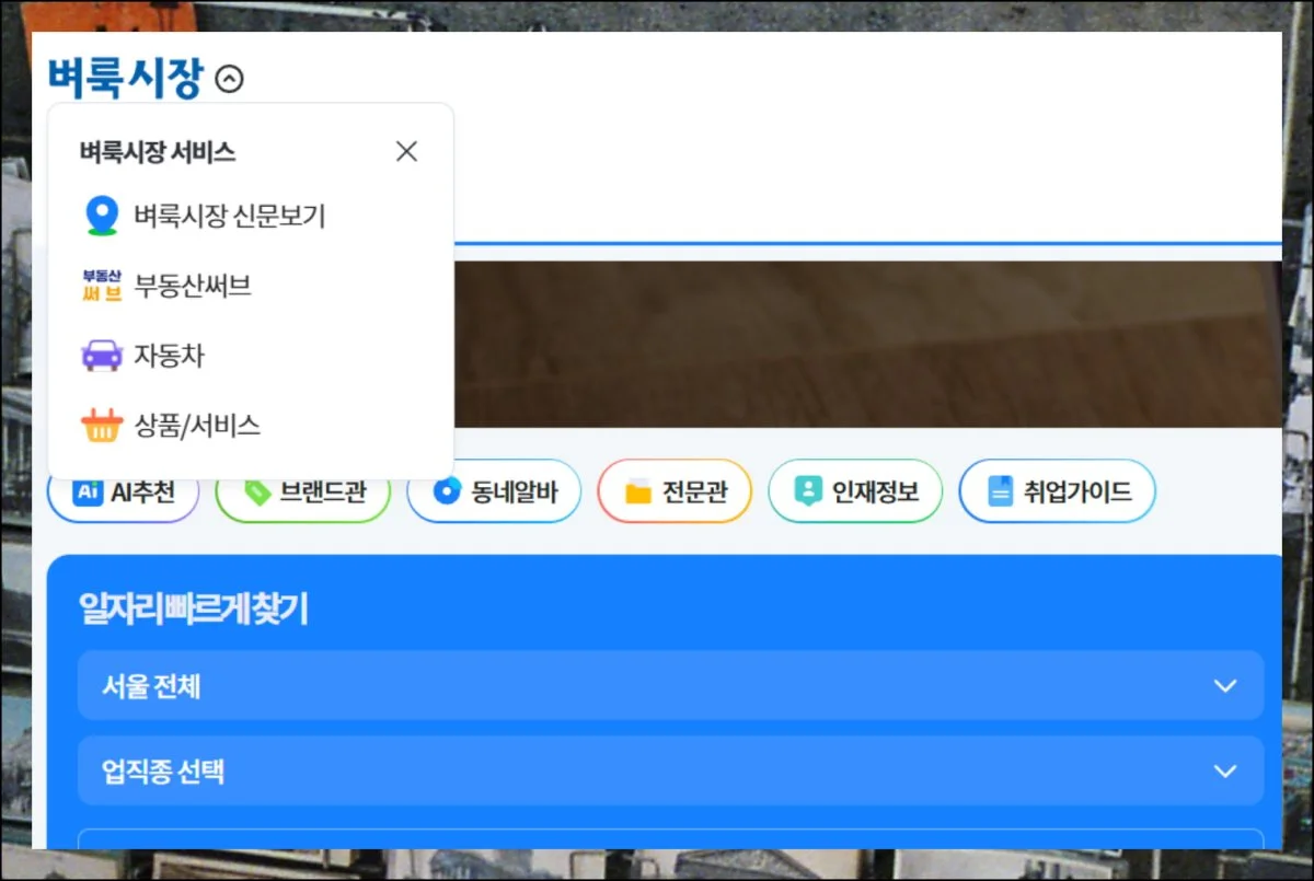 뷰어 왼쪽 상단을 보면 서비스 목록이 정리되어 있어요. 구인구직이나 부동산 같은 카테고리를 바로 클릭할 수 있습니다.
