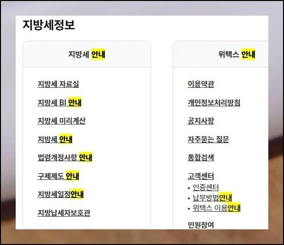 우선 지방세 정보 영역으로 이동한 뒤, 지방세안내 탭을 눌러주시면 됩니다.