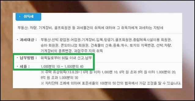 화면에 부동산 취득세의 구체적인 안내가 표시돼요. 과세 대상, 납부 절차, 적용 비율을 세심하게 살펴보세요.