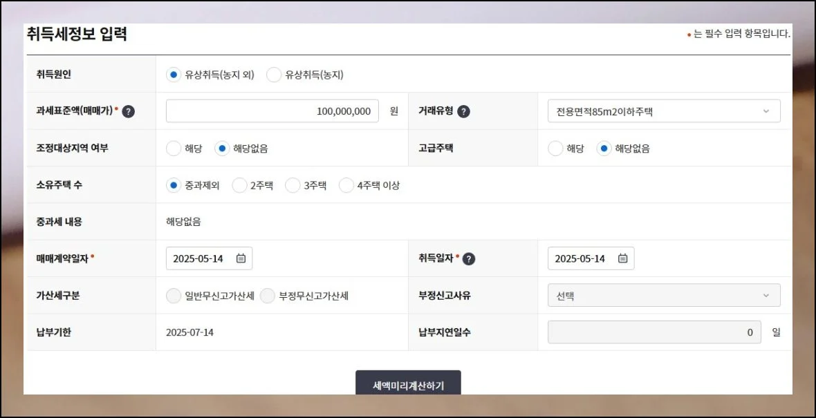 예를 들어 시가 1억 원인 부동산 주택을 매매로 획득했다고 설정해보겠습니다. 이 조건으로 예상 금액을 뽑아볼게요.