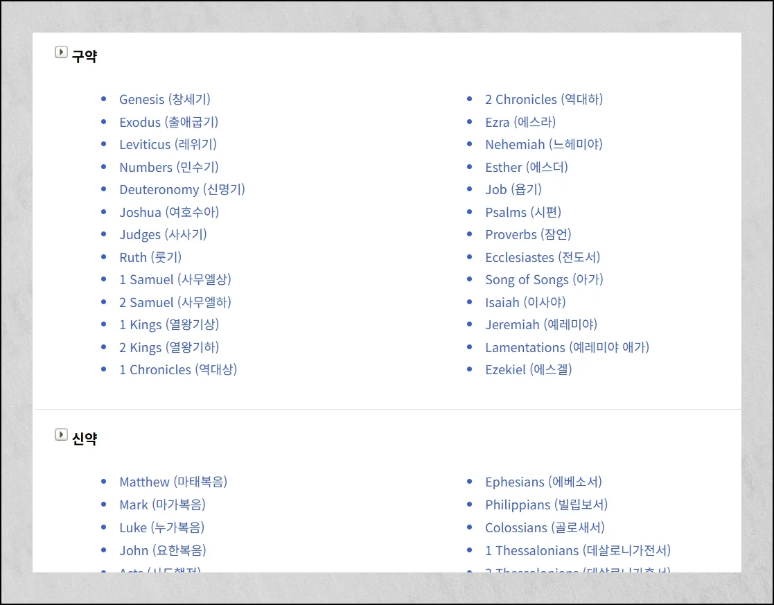 새로운 페이지로 넘어가면 전체 쳅터를 한번에 볼 수 있어요. 구약과 신약에 포함된 모든 책들이 체계적으로 나열되어 있어서 원하는 부분을 쉽게 찾을 수 있습니다.