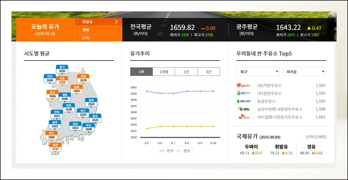 국제유가 동향부터 우리 동네 최저가 주유소까지 한 번에 확인할 수 있어서 정말 유용합니다.