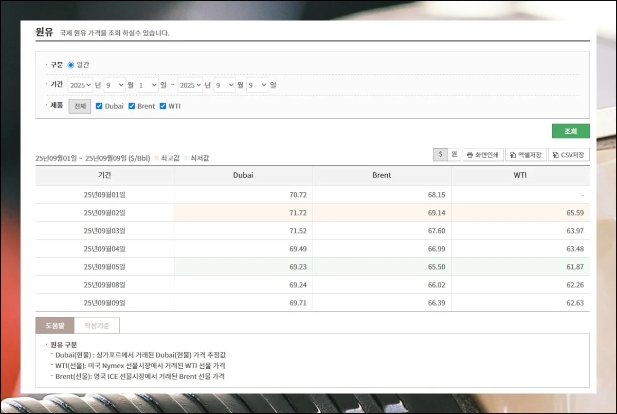 DUBAI, WTI, 국제휘발유, 국제경유 가격을 일간 또는 주간 단위로 추적 가능합니다.