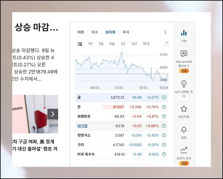 원자재 탭만 클릭하면 WTI유 유가정보에 바로 접근할 수 있어요.