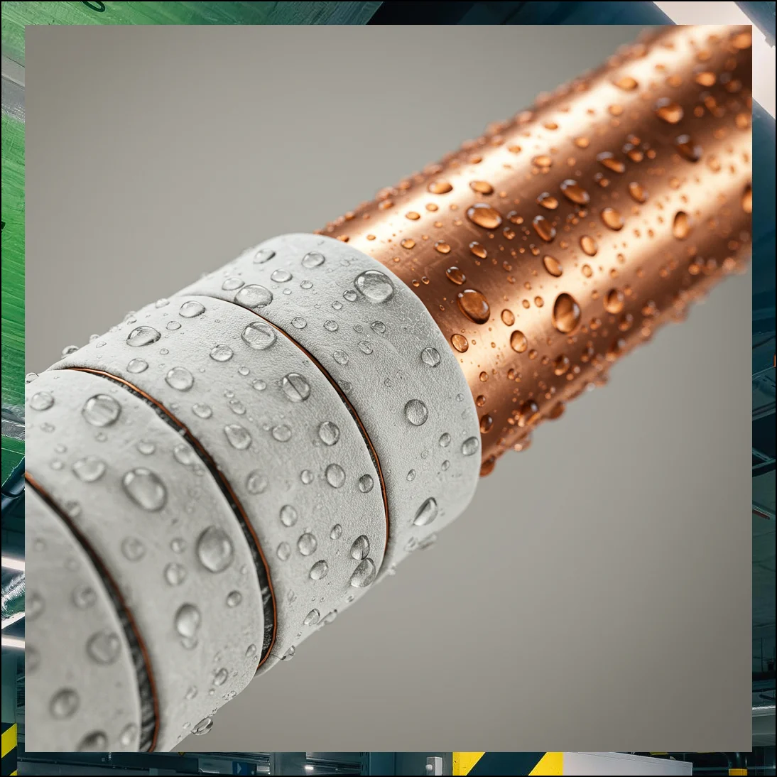 이런 결로 현상으로 인한 물방울을 방지하기 위해 보온재와 마감테이프로 배관을 완전히 감싸는데요. 차가운 동관이 더운 외부 공기와 직접 만나지 않도록 차단하는 것이 시공의 목적입니다.
