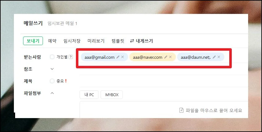 한 번에 여러 사람에게 보내려면 받는 사람 주소를 계속해서 추가하실 수 있습니다.