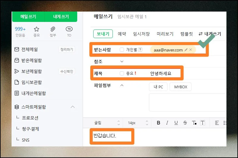 받는 사람의 주소를 제일 먼저 입력하시고요. 그다음에는 제목란에 내용을 요약해서 적으세요. 본문에는 전달하고 싶은 메시지를 자유롭게 작성하시면 됩니다.