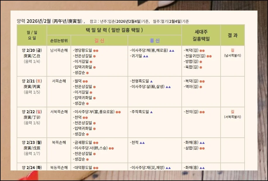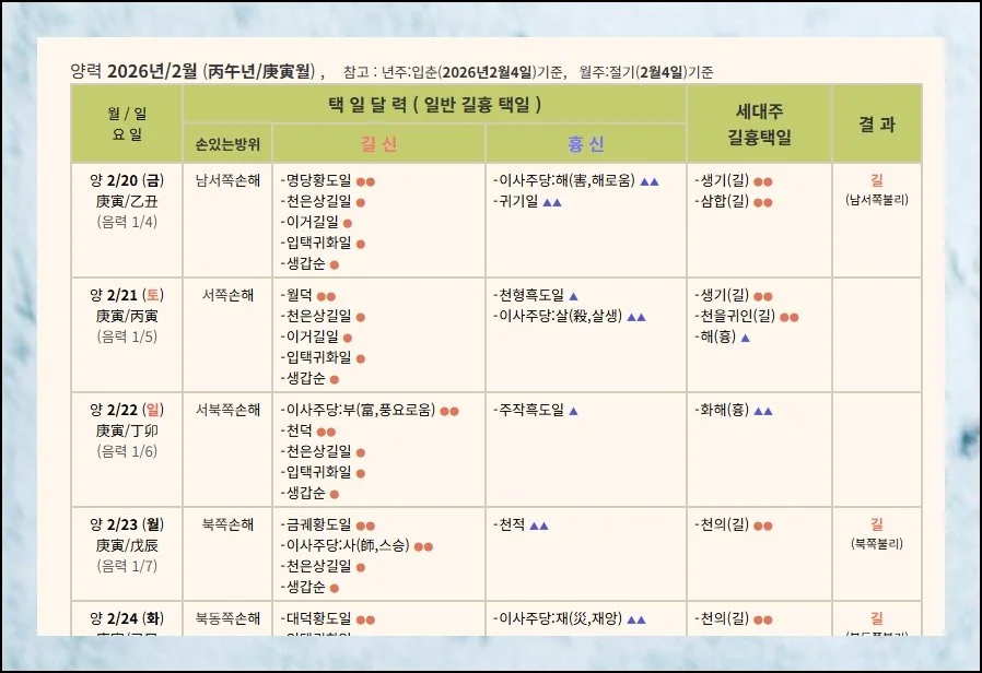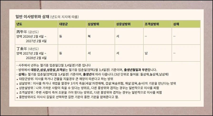 거주지를 옮길 때 어느 이사방향을 선택하느냐에 따라 받는 에너지가 개인마다 다릅니다. 2026년 2월에 조심해야 할 방위가 별도로 정리되어 있어요.