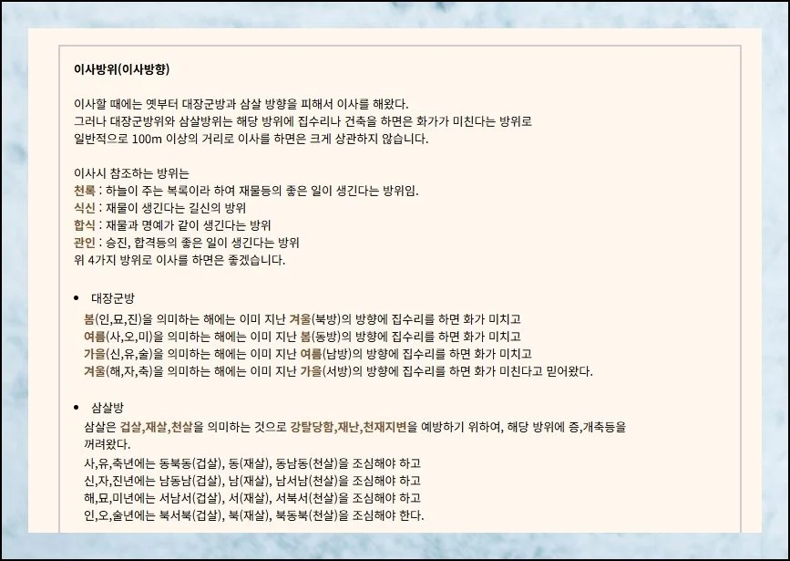 이사방향 보는법에 관한 기초를 먼저 익혀 두면 좋아요. 옛 선조들은 이사 갈 때 대장군방삼살에 해당하는 곳을 경계했다고 합니다.