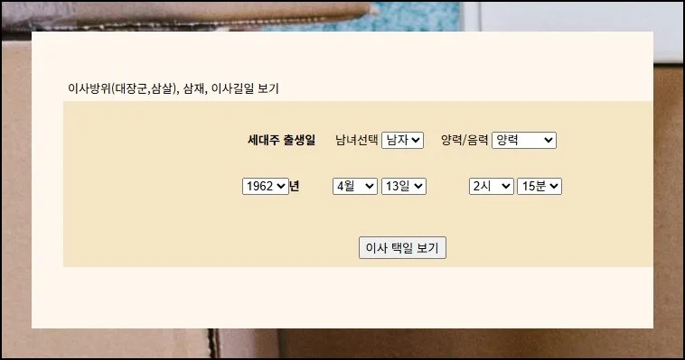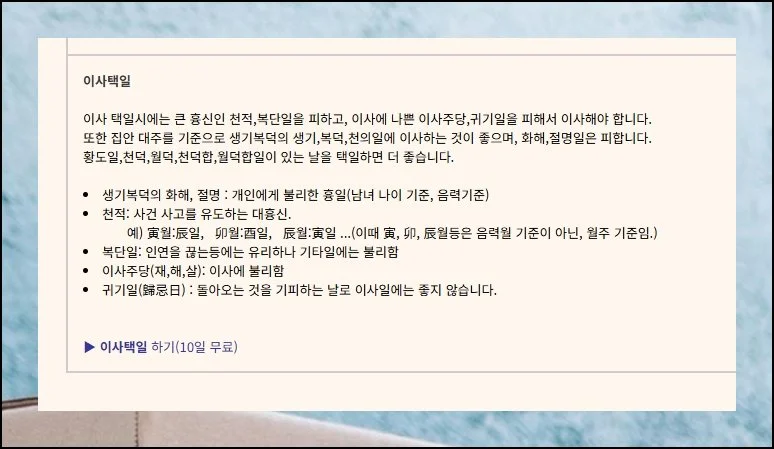 홈페이지에 도착했다면 상단 메뉴에서 이사택일 항목을 선택해 주세요. 이 기능을 활용하면 이사방향과 일정을 동시에 점검하며 보는 것이 가능합니다.